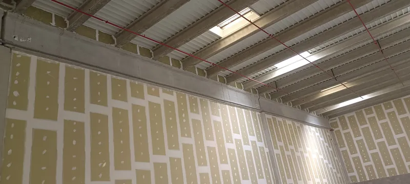 La compartimentación mediante tabiques, trasdosados y falsos techos resistentes al fuego permite sectorizar espacios y proteger instalaciones críticas. En muros cortina, el sellado del paso de forjado evita la propagación del fuego entre plantas.